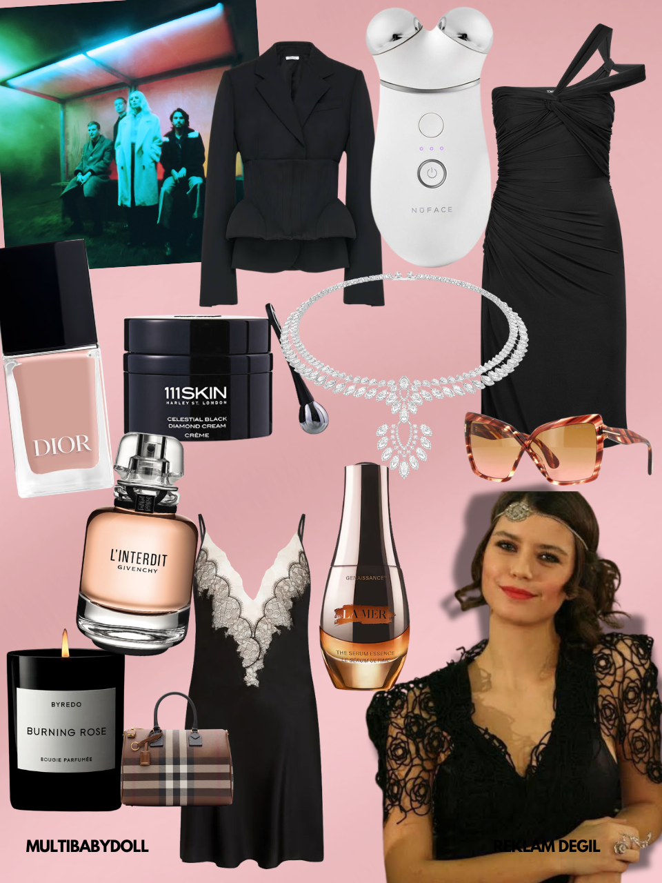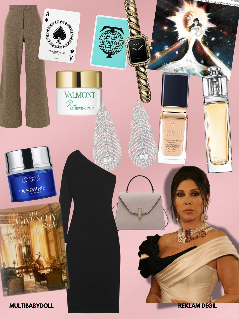 111Skin Black Diamond Cream, Valmont Prime Renewing Pack Bakım Maskesi, Tom Ford Tek Omuz Kokteyl Elbisesi, Alexander McQueen Korse Ceket, Messika “Desert Bloom” Pırlanta Gerdanlık, La Mer“Genaissance de la Mer” , NuFace “Trinity+” Cihaz, Agent Provocateur Vitoria Short Slip Gecelik, Tom Ford Fiore Gözlük, Byredo “Burning Rose” Mum, Givenchy L’inderdit Parfüm, Dior 100 Nude Look Oje, Burberry Medium Check Bowling Bag