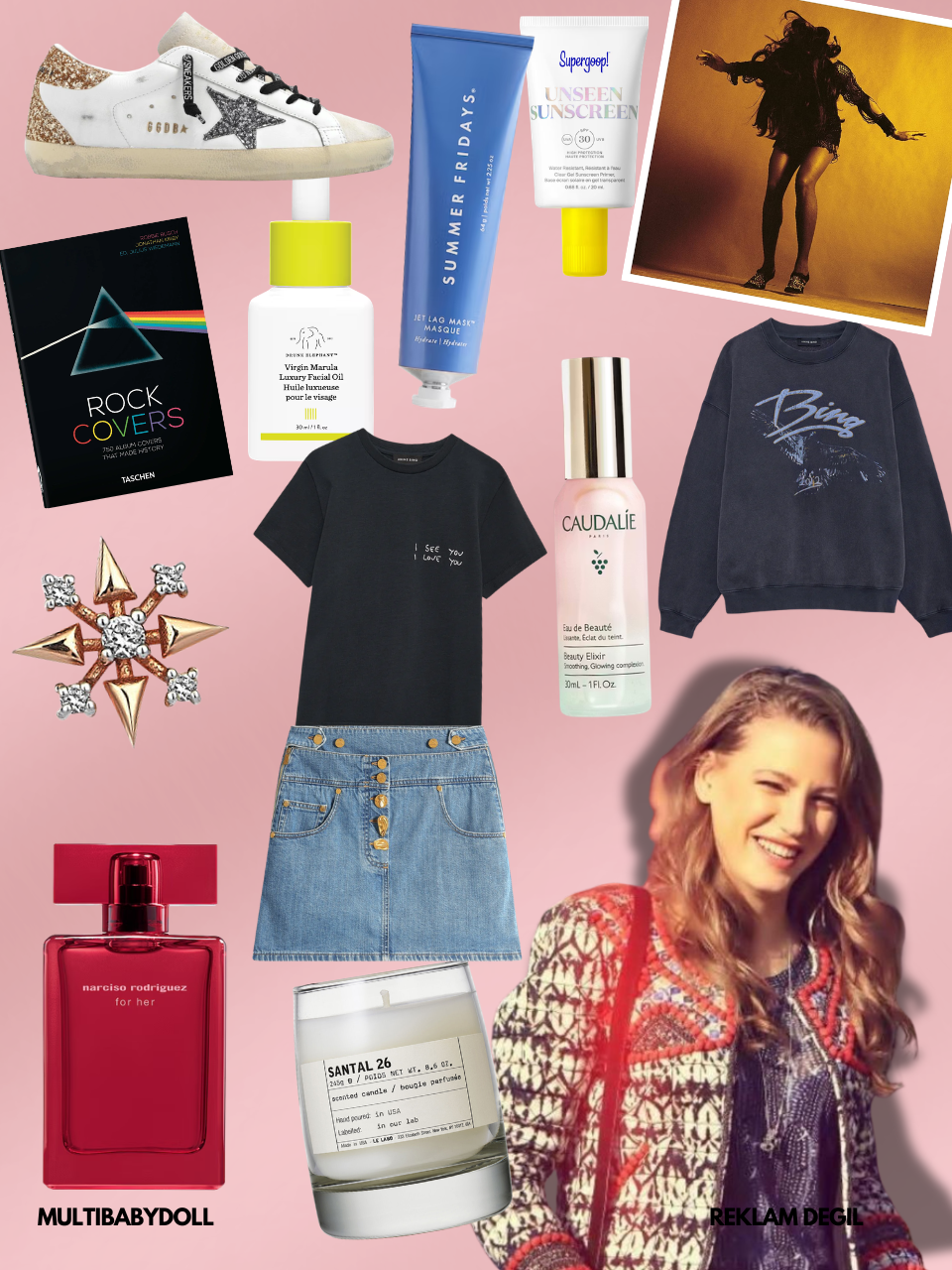 SUPERGOOP! Unseen Güneş Kremi, DRUNK ELEPHANT Virgin Marula Luxury Facial Oil, SUMMER FRIDAYS Jet Lag Mask, Caudalie Beauty Elixir, Anine Bing Tişört, Anine Bing Sweatshirt, Kısmet by Milka Pırlantalı Kadın Altın Tekli Küpe, The Last Shadow Puppets Everything You’ve Come to Expect, Taschen “Rock Covers” ,Le Labo “Santal 26” Mum, Schiaparelli Kot Etek